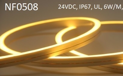Neon-Flex 0508, (5x8mm, 0.20x0.30in), 24VDC, 6 Watts/meter, 1.9 Watts/feet, 60LM/W, Dimmable, Cuts 50mm, Side Bend, Top Emitting. Available in 10m/32ft, 5m-16ft, 1m-3.2ft. (Accessories; Aluminum tracks 1meter/3.2ft, Stainless Steel Bendable tracks-5meter/16ft, Aluminum clips-30mm